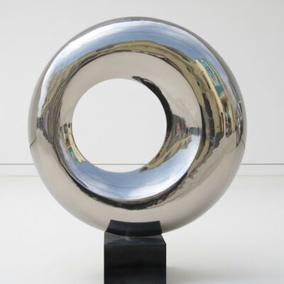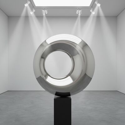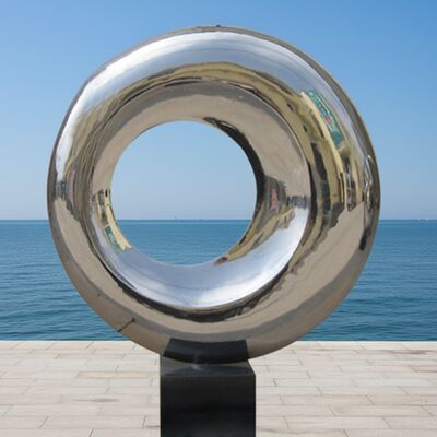 To nowoczesne dzieło sztuki ze stali nierdzewnej charakteryzuje się powierzchnią o wysokim połysku, która odbija światło i otoczenie, zamieniając abstrakcyjną okrągłą formę w dynamiczny punkt centralny dla każdej nowoczesnej przestrzeni.