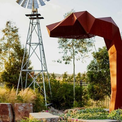 Wykonana z charakterystycznej stali odpornej na warunki atmosferyczne, ta rzeźba oddaje dynamiczną formę węża. Zaprojektowana do instalacji zewnętrznej, jej uderzająca sylwetka i ewoluujące wykończenie z patyną rdzy tworzą mocne wizualne oświadczenie, które z pewnością przyciągnie wzrok.